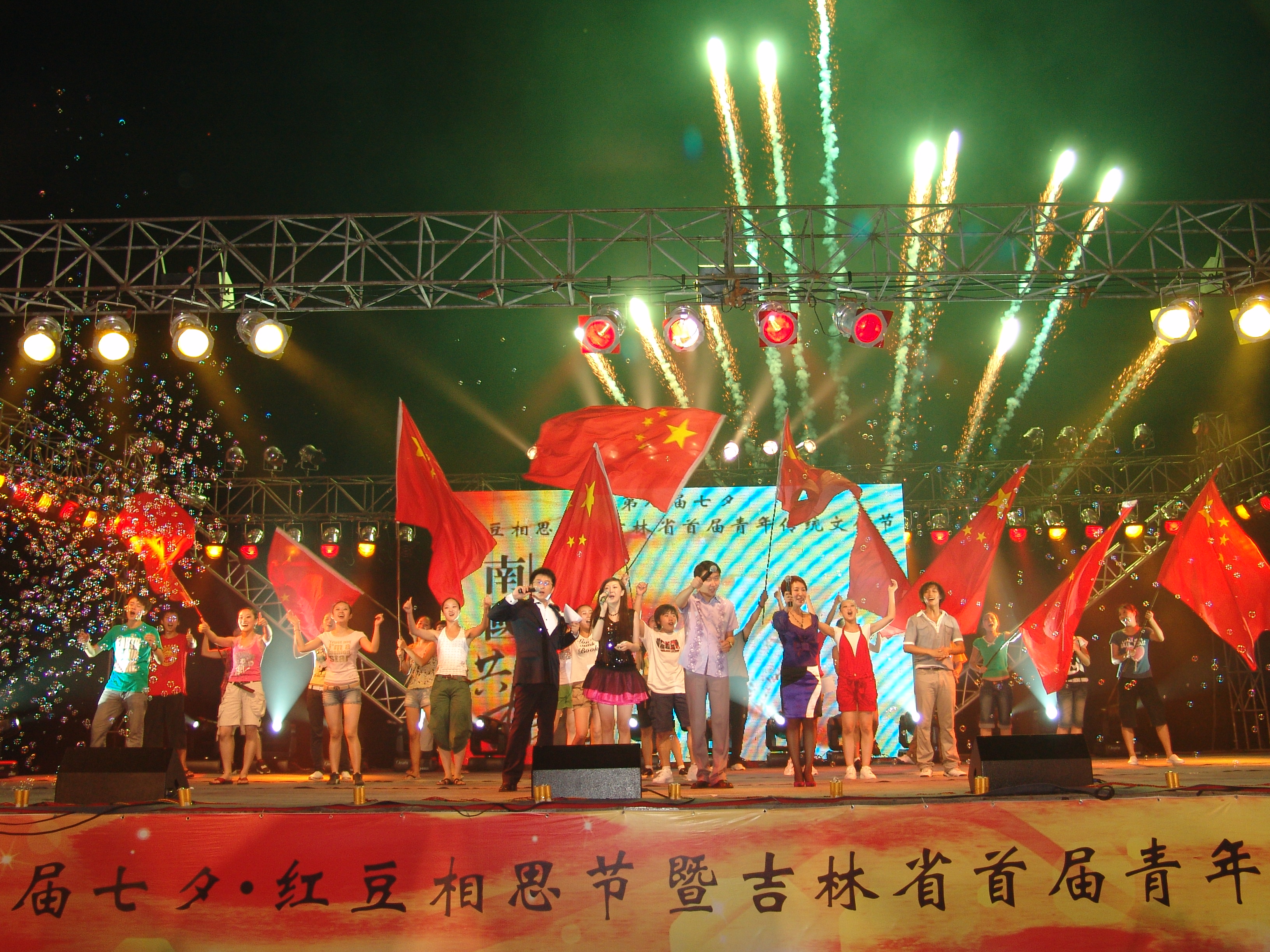 傳統(tǒng)七夕節(jié)(8月7日)這一天晚上,長春市文化廣場歌聲陣陣,音樂滿天,到處可見心形的氣球、鮮紅的玫瑰,一盞盞心愿燈緩緩升起,這里正在舉辦第八屆七夕·紅豆情人節(jié)暨吉林首屆青年傳統(tǒng)文化節(jié)。首推七夕·紅豆情人節(jié)的周耀庭在這次活動(dòng)中高興地說“紅豆集團(tuán)原本計(jì)劃要用5個(gè)5年的時(shí)間推廣七夕節(jié),但現(xiàn)在看來這個(gè)時(shí)間要提前了?!?這次活動(dòng)由共青團(tuán)吉林省委、吉林省青年聯(lián)合會、紅豆集團(tuán)、吉林電視臺、城市晚報(bào)社、長春交通之聲共同舉辦,共青團(tuán)吉林省委書記謝忠?guī)r,九屆、十屆全國人大代表、紅豆集團(tuán)董事局主席周耀庭等領(lǐng)導(dǎo)出席了這次活動(dòng)。文化廣場上人山人海,有20000多名長春市民積極自愿參加這次活動(dòng),快樂的度過了美麗的七夕。