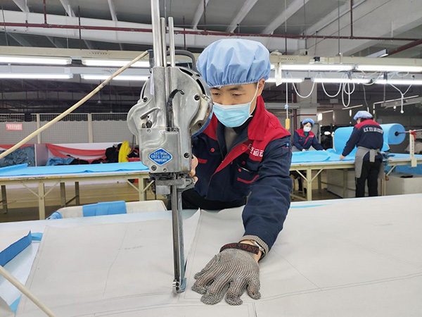 “沒有現(xiàn)成的提拉工具,就想其他辦法。先用鏟車把面料運(yùn)到指定區(qū)域,為提高效率,我們用2個(gè)板凳自制了工具,順利將面料快速送上裁剪臺(tái)?!卞X學(xué)民笑著說。