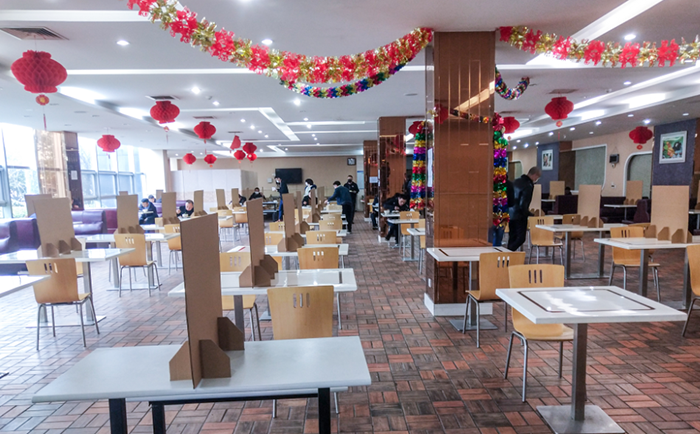 兵馬未動(dòng)糧草先行。在復(fù)工之前,公司利用現(xiàn)有資源通過(guò)各種渠道采購(gòu)了大量口罩,防護(hù)服、酒精、消毒液等防疫物資也已全部到位。公司食堂實(shí)行人員錯(cuò)峰分流措施,員工就餐分時(shí)分批、限時(shí)限流,避免人員在食堂中聚集,進(jìn)食堂前需檢測(cè)體溫,排隊(duì)取餐需間隔一米,每桌限坐2人,中間用板隔開(kāi),且一律同向而坐,避免隔桌交談。