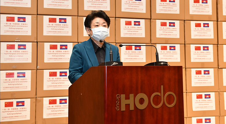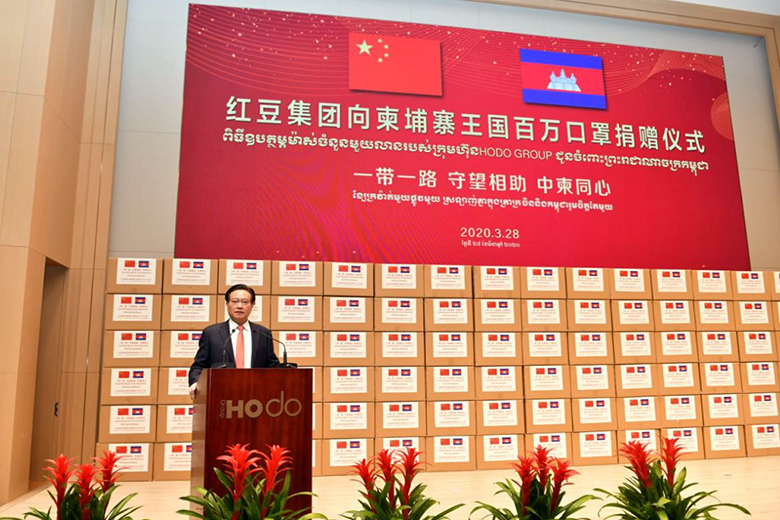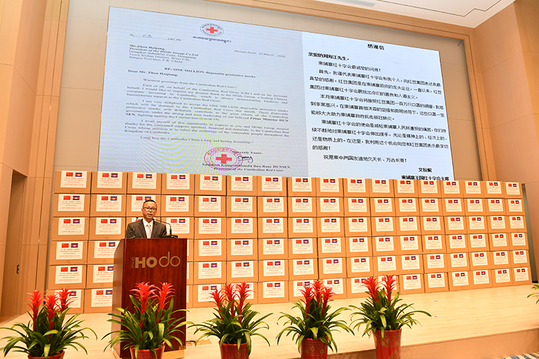 周海江在儀式上表示,在習(xí)近平總書記的親自指揮、親自部署下,我們舉國上下同心抗疫,經(jīng)過60多天的艱苦奮斗取得階段性勝利。而在中國抗疫斗爭初期最艱難時(shí)刻,洪森首相不顧危險(xiǎn),親赴北京,雪中送炭,支持中國抗疫,體現(xiàn)了危難之際中柬兩國的深厚兄弟情誼。多年來,在洪森首相的英明領(lǐng)導(dǎo)下,柬埔寨經(jīng)濟(jì)發(fā)展迅猛,現(xiàn)在柬埔寨疫情防控進(jìn)入攻堅(jiān)期,作為在柬投資的中國龍頭企業(yè),紅豆集團(tuán)用實(shí)際行動(dòng)誠摯表達(dá)中國人民對(duì)洪森首相英明領(lǐng)導(dǎo)的一份敬意。