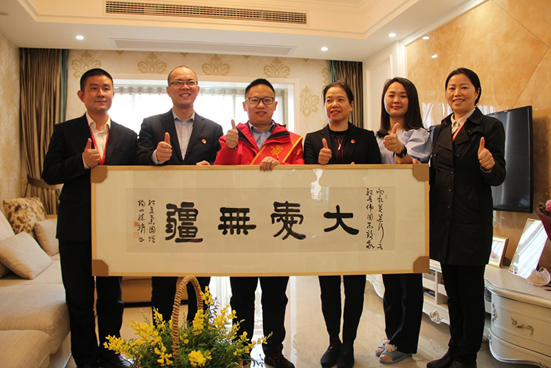 下午,紅豆集團常務副總裁、國際公司董事長戴敏君,集團品牌文化部部長錢文華率紅豆物業(yè)團隊來到殷晉偉家,上門送上最誠摯的慰問,贈予殷晉偉“大愛無疆”牌匾,代表紅豆集團全體員工向英雄表達崇高敬意!“大愛無疆”牌匾由中國書法家協會理事、無錫市國畫院院長孫璘先生親自揮毫書寫,筆鋒蒼勁有力,一筆一畫盡顯孫璘先生對“逆行英雄”的真情真意?!?/p>