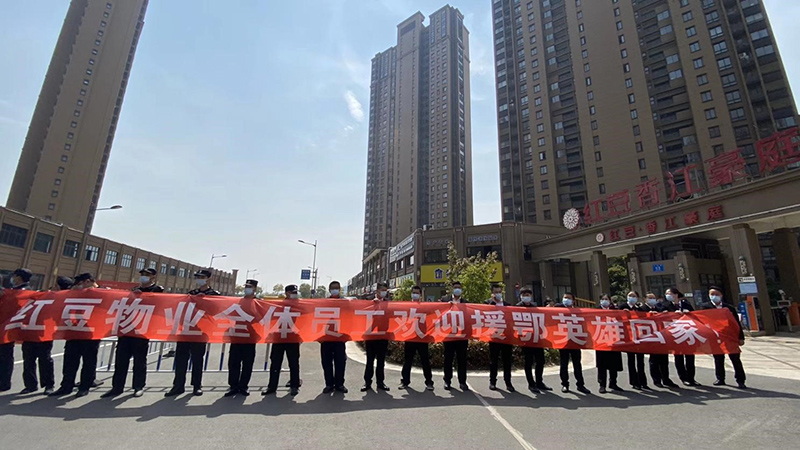出征還是冬日,歸來已是花期。經過70多天的奮戰(zhàn),武漢重啟,英雄凱旋。4月14日上午,紅豆香江豪庭小區(qū)援鄂英雄殷晉偉醫(yī)生凱旋回家,懷著對英雄的崇高敬意,紅豆物業(yè)全體員工早已列隊,手拿紅旗,拉起了歡迎條幅——“紅豆物業(yè)全體員工歡迎援鄂英雄回家”,在小區(qū)門口等候英雄的到來。