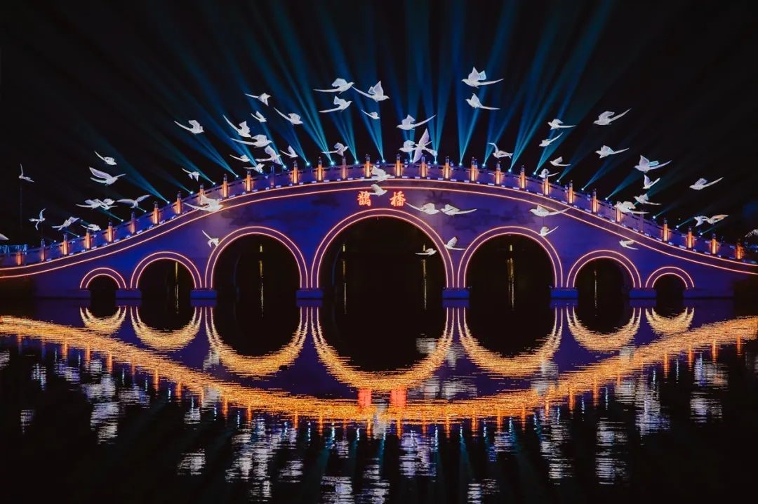 2018年,央視七夕晚會(huì)首次在南北兩個(gè)會(huì)場平行推進(jìn),南依然是江西新余仙女湖,北則選了有著深厚七夕節(jié)文化淵源的陜西西安昆明池。一臺晚會(huì),“南北共此夕”,南方的溫柔婉約和北方的古樸大氣在這里交相輝映;一座鵲橋,牽起南與北,為舞臺增添了一份穿越時(shí)空對話的美感。兩地得天獨(dú)厚的自然景觀,令整臺晚會(huì)以天為幕、山為景、水為臺,形成一幅情景交融的藝術(shù)山水畫。