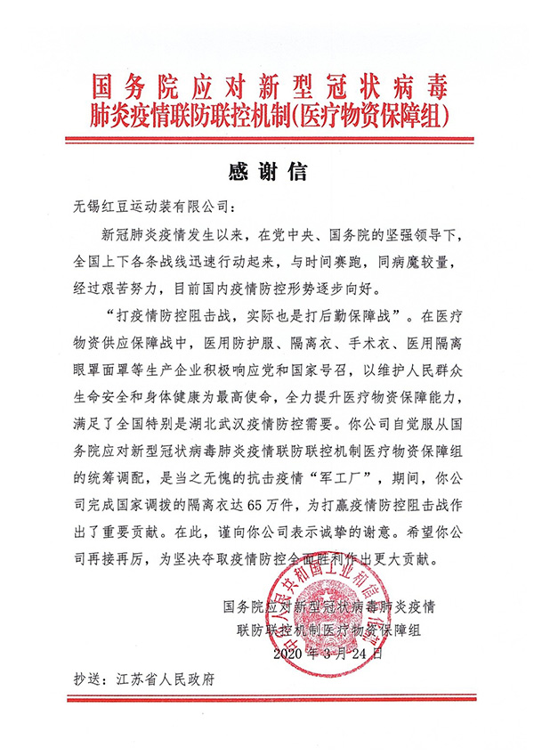 這是3月24日,紅豆集團(tuán)下屬的紅豆運(yùn)動(dòng)裝公司收到國(guó)務(wù)院應(yīng)對(duì)新型冠狀病毒肺炎疫情聯(lián)防聯(lián)控機(jī)制醫(yī)療物資保障組的感謝信中的一段話。